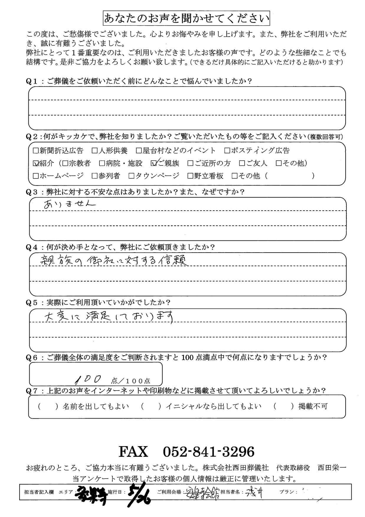 事前相談の折、ご縁をいただき、間もなくのご依頼となりましたが、御親族として喪主様を支えられるお姿に、自分も少しでも力になれればと精一杯努めさせていただきました。 今後もゆっくり歩んで行かれるのを陰ながらお手添えさせていただければと存じます。 時節柄、喪主様とともにお身体にはくれぐれもお気を付けくださいませ。 アンケートご協力ありがとうございます。