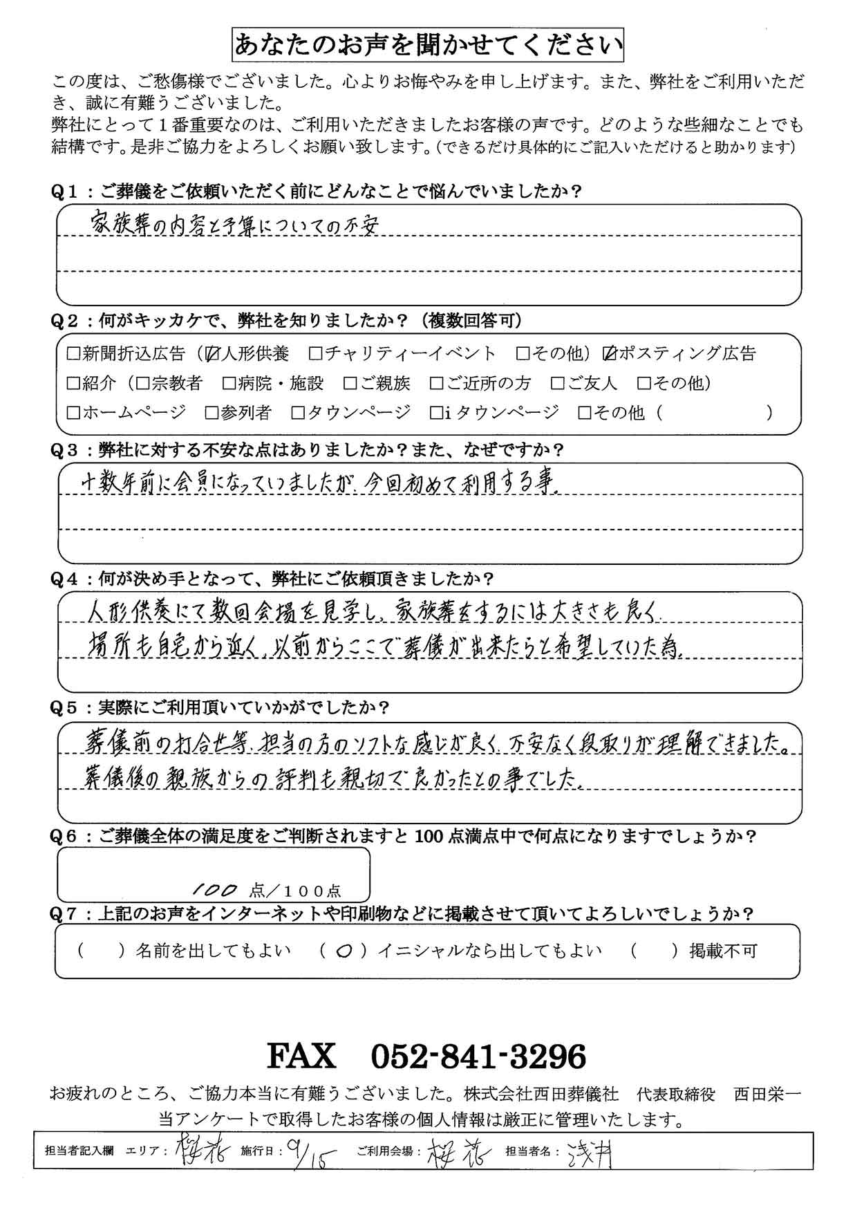以前に道看板で弊社を見つけていただき、また、新館エニシアをご見学され、大変気に入って頂けました事をよく覚えております。 エニシアが空いていたのも、偶然では無かったのかもしれません。 皆様がご自宅のようにくつろぎながら、故人様へ話しかけていらっしゃるお姿が印象的でした。 時が流れ紅葉し始める頃に忌明けですね。どうぞご自愛くださいませ。 お忙しいなかでのアンケートへのご協力をありがとうございました。