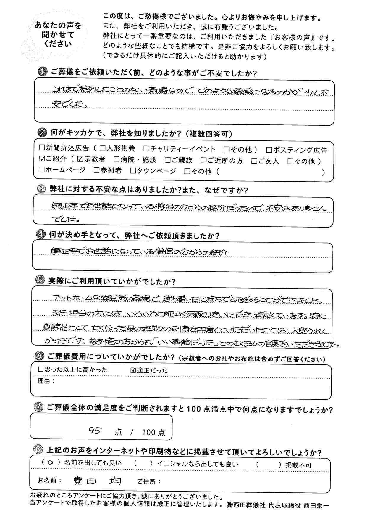 豊田様、この度はアンケートへのご協力誠にありがとうございました。