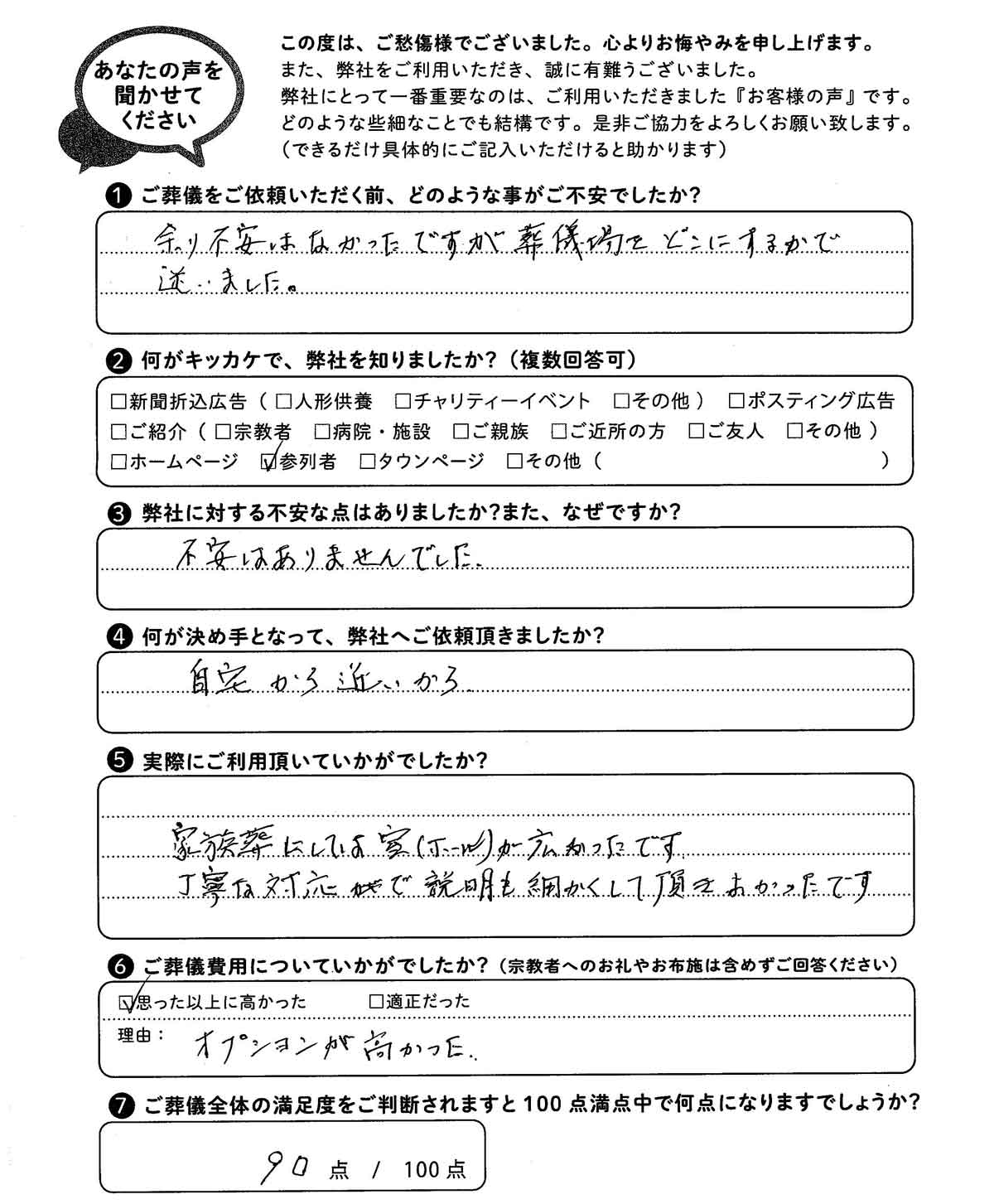 不安な中、最大限に答えて頂き、感謝しております。直接的に担当頂く高尾様には色々とご配慮下さり迅速な対応をして頂き、身内だけの温かい雰囲気に包まれた葬儀ができました。ありがとうございました。