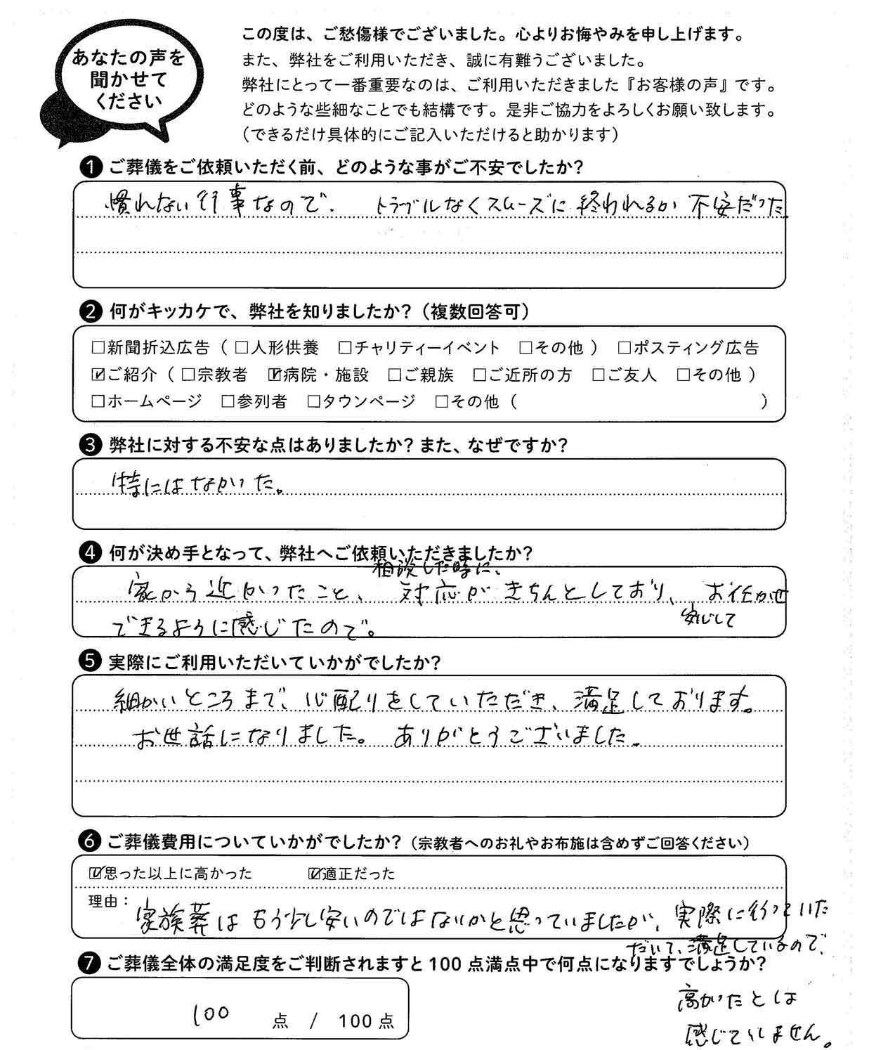 この度はアンケートのご協力誠にありがとうございます。前回のご葬儀からまもなくのご心痛癒えぬ内のご依頼でした。