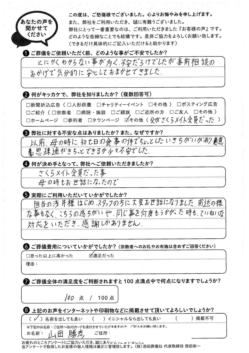 この度はアンケートへのご回答、誠にありがとうございます。かねてより、お父様から再三のご相談をいただき、お手伝いさせていただくことができた事、非常に光栄に思っています。