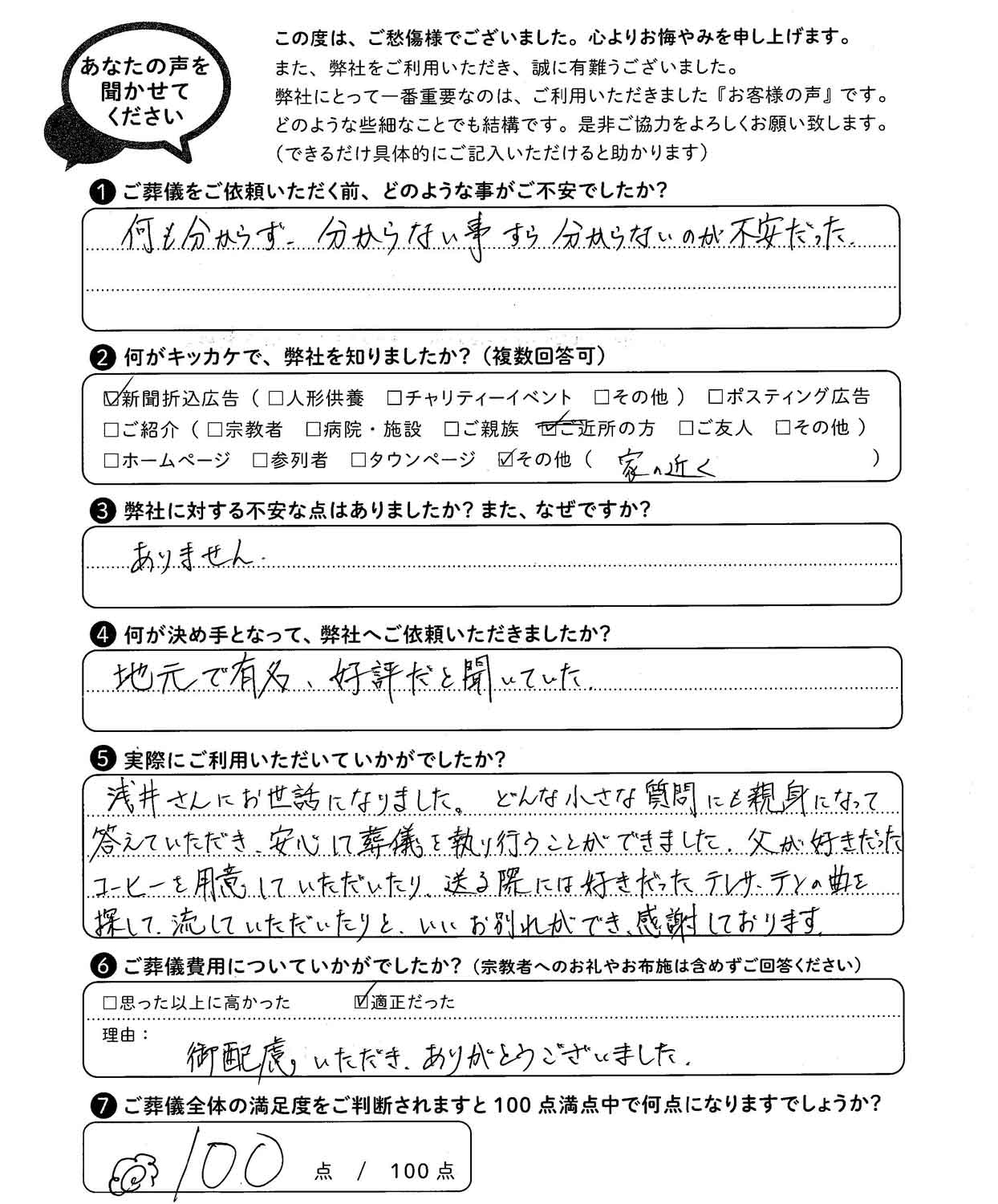 忌明けも済み、ご多用の中アンケートのご協力誠にありがとうございます。